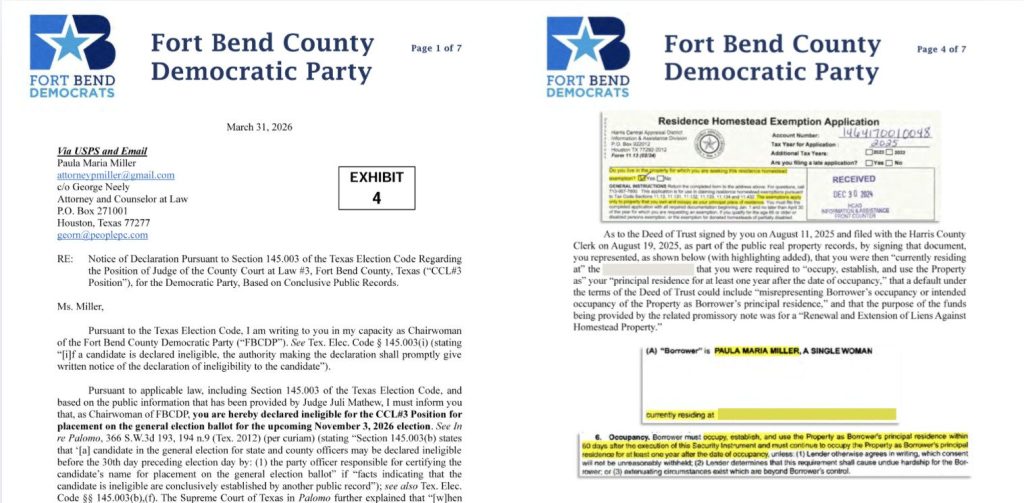 Miller applied for a homestead exemption in Harris County on December 30, 2024. Her car is registered to an address in Houston. Property records show the address she claims in Richmond is owned by a third party. Evidence also show Miller voted in Harris County in November 2024.